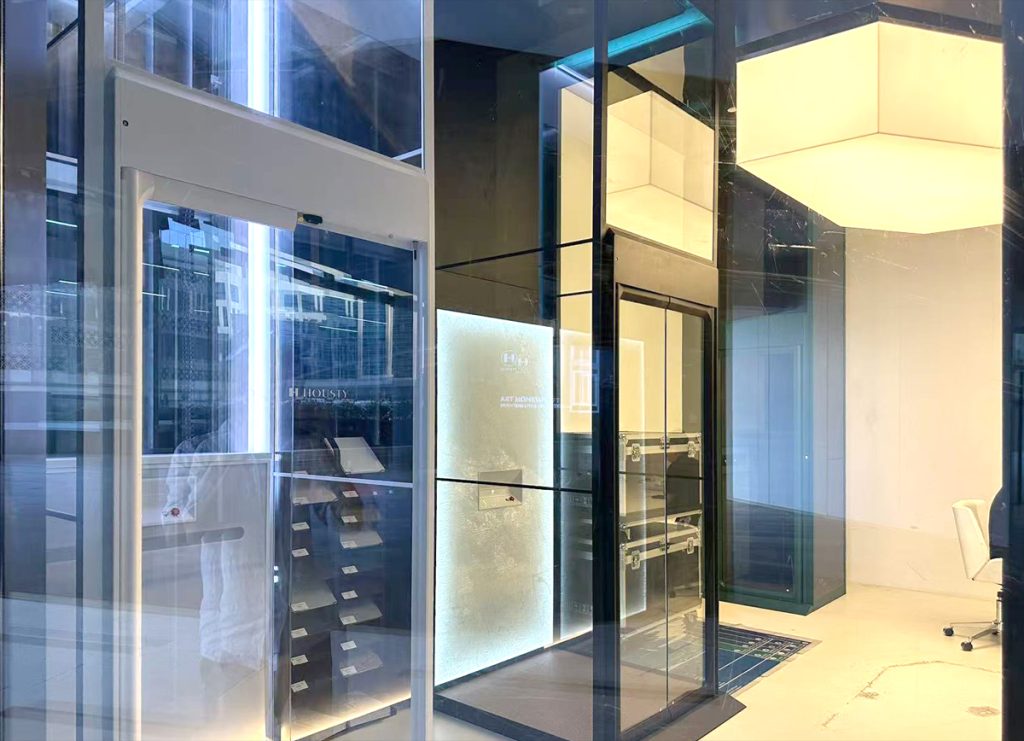 Inside the showroom, we have installed three demonstration elevators — models HA, HE, and HS, in green, white, and black respectively. These are among the most representative models in our product line, designed to meet the needs of most villas and duplex apartments in the Middle East.